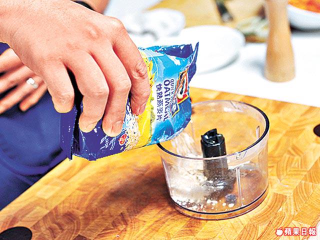 1.把快熟燕麥片放進攪拌機,加入鹽及黑胡椒攪碎。蛋和鮮奶混和。京葱切3吋段;蒜頭壓茸;芫荽剁碎。