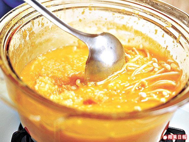 3.下南瓜,加蓋以細火煲1小時,加入已洗淨的金菇,加鹽,再多煲5分鐘即成。