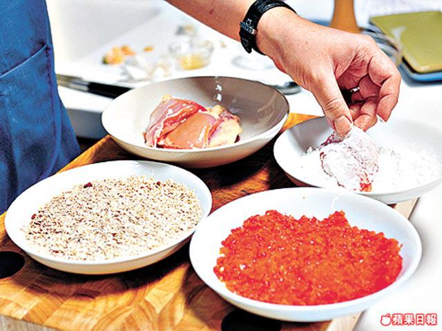 2.把即食麥片、海鹽、小茴香粉和甜椒粉混和。雞扒去皮,切件,依次序沾上生粉、紅椒漿和混合香料後的麥片。