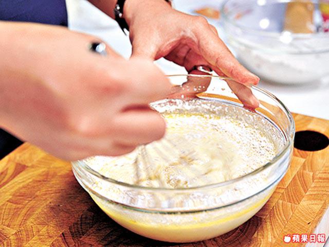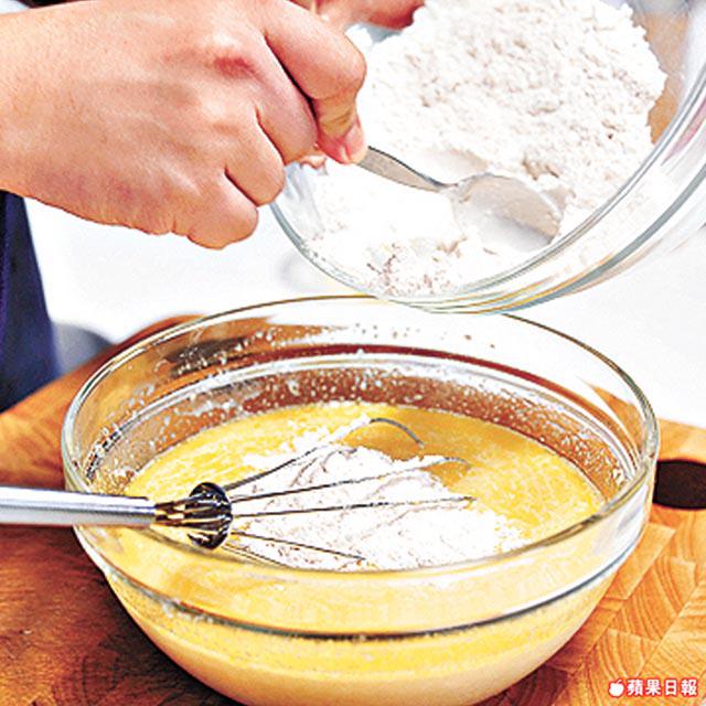 2.把蛋和牛油溶液加進燕麥脫脂奶中,分數次加入混合麪粉,把所有材料混和。