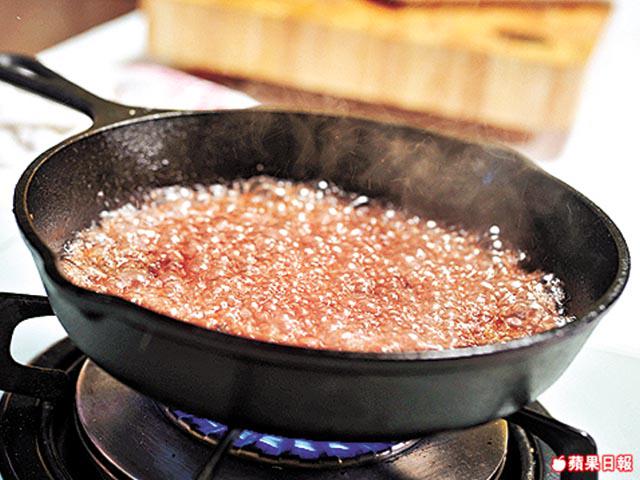 3.準備平底鑊,開中火,下適量油,倒進一塊份量粉漿,煎約45秒。