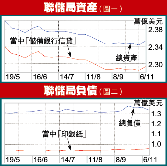 圖一所見,聯儲局自5月下旬至上周的資產反覆向下,上周才稍回升;當中最大的一件「儲備銀行信貸」(即包括MBS等垃圾的大項)走勢相若。