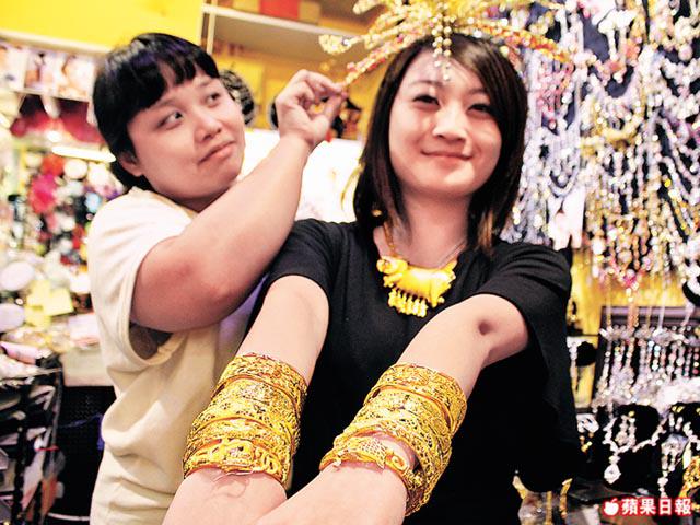 就算80後新人不介意仿金,雙方父母或許會介意,Angel深深明白。因她剛剛舉行完婚禮,所戴的就是自己設計的仿金飾物,她說:「媽媽最初也堅持要買給我足金龍鳳鈪,但我覺得倒不如折現,給我來買樓更好。」從面子角度看,龍鳳鈪也不過是斟茶時用來炫耀的道具,Angel也認同:「以前送龍鳳鈪是祝福新人情比金堅,趨吉避凶,女仔很重視收到龍鳳鈪;但今天已成為順應傳統而戴的例行飾物而已,大家在乎鈪的粗幼多於意義。既然是例行公事,那麼戴仿金更好,一來仿金較硬身不怕凹,二來便宜不怕弄?。反正足金與仿金亦未必易看得出,仿金可做得更粗,試過有位客人,她是水上人,所以親朋都折現,她便用當中五千元租了32對仿金龍鳳鈪,還多到戴不下,她告訴我那晚嫁得很開心。」店員Karen也是80後,問她們兩人愛鑽石還是黃金,兩人異口同聲:「當然是鑽石,結婚戒指用黃金,我可不嫁,太老土了。」