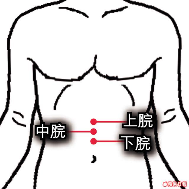 雙手食指、中指、無名指重叠並按在胸骨下柔軟部位,俗稱心口窩的地方,順時針方向打圈,按摩21次,再逆時針方向按摩21次。