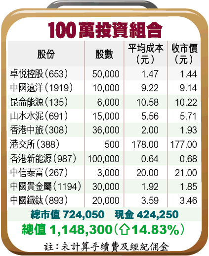 組合方面,魏力在周一買入中國鐵鈦(893)後,昨並無入市買賣,現時現金維持3成水平。看上中國鐵鈦,主要是Buy佢西部大開發概念。中國鐵礦石依賴進口,但運往內陸的成本不菲,反觀鐵鈦的礦場就在四川,運輸成本大減,競爭力自然較高。