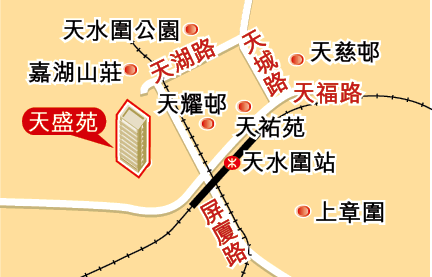 天盛苑由13座康和式居屋及4座和諧式居屋組成,位處物業東南面的和諧式A至D座最近天水圍站,康和式E至R座(不設I座)則分佈屋苑的西北面,即使是距離港鐵站最遠的座別,步程其實也只是多出3至5分鐘。