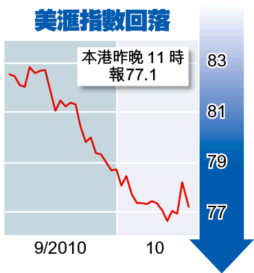 美元連升三日後昨回軟,歐元早段升2.52美仙,見1.3978美元。商品價格亦隨即反彈,現貨金一度升13.5美元或1%,高見每盎斯1345.55美元;而白銀價亦曾漲2.3%,報每盎斯23.91美元;紐約期油一度抽高近2美元,高見每桶81.41美元。