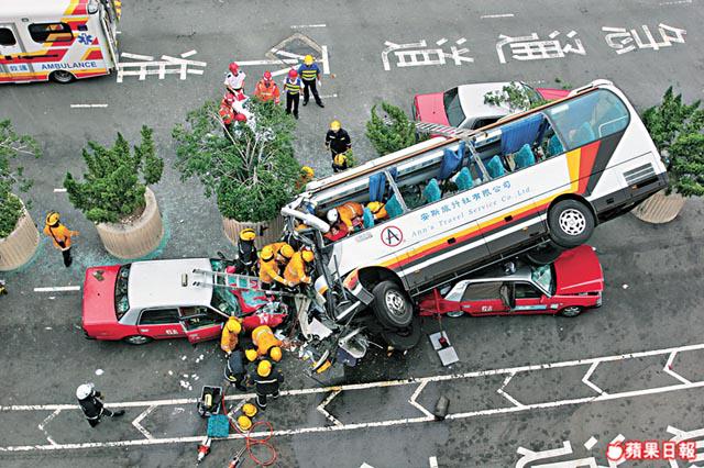 一聲轟然巨響後,黃的士車尾和羅的士車頭同被壓扁,旅巴車頭嚴重毀爛,繼而倒下壓向前面的士,結果前面的士左邊車身遭整輛旅巴車身完全壓扁,後面的士則車頭被壓凹,偏偏兩輛的士的司機位都奇蹟地沒有半點被壓中。黃、羅兩人大吃一驚,但全身絲毫無損,慌忙打開車門拔足狂奔,逃過大難。