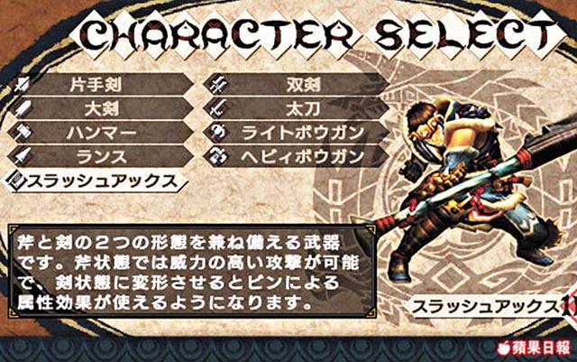 武器方面,芒亨Fans熟悉嘅武器都用得番,而且仲見到可以變形嘅斬擊斧(斧刀),雖然感覺上打起嚟鈍鈍哋,不過特別在於有兩種形態,在斧形時攻擊力很大,而轉到劍形時命中率就比較高,亦比較容易打出連擊,但要花時掌握距離。