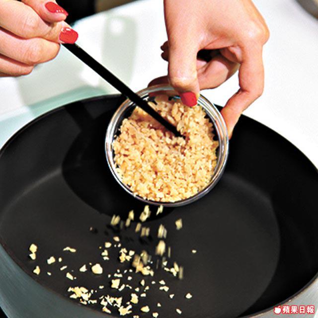 1.燒熱白鑊,放入已洗淨瀝乾的甜蘿蔔乾碎,以小火炒至乾身。