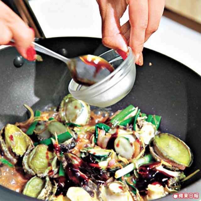 3.燒熱鑊下油,爆香薑絲、紅葱頭和葱段,將鮑魚肉回鑊,灒酒,加生抽、水、蠔油和糖,以大火快炒,最後放甜紅椒絲略炒即可。