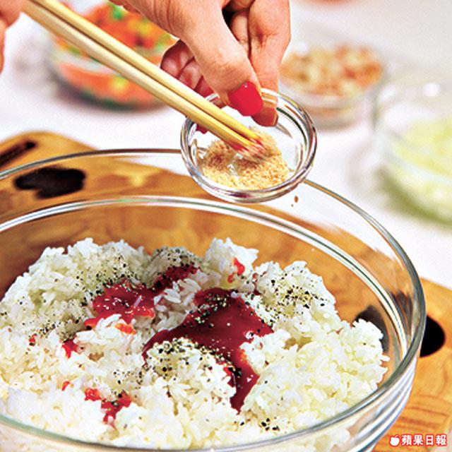 1.將飯弄鬆,加入番茄醬、黑胡椒和香菇粉拌勻。