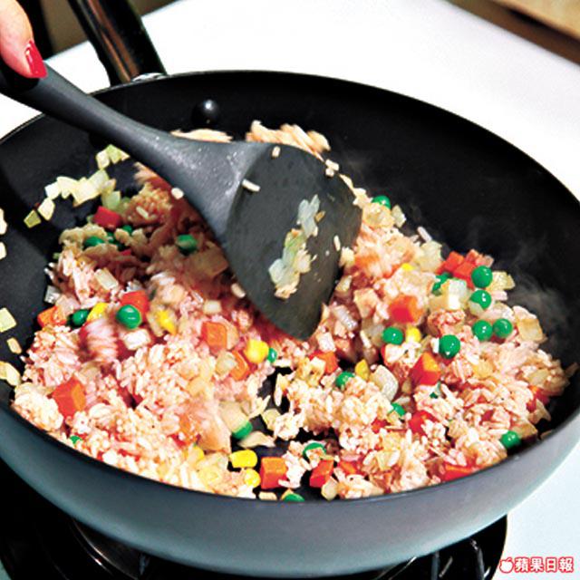 2.燒熱鑊下油,爆洋葱至微黃,加入三色菜和素肉丁同炒,再分批放已調味的飯,並炒至乾身後盛起備用。