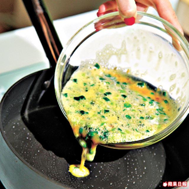 3.燒紅鑊下油,加蛋液,以中火煎至兩面金黃。將蛋取出,捲起,切塊即成。