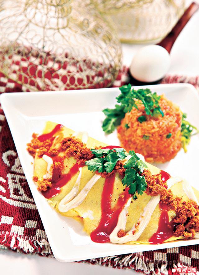 4.把飯鋪在蛋皮上,包起,唧上番茄醬和沙律醬,再放肉鬆、芫荽,在旁多配一碗炒飯即可。