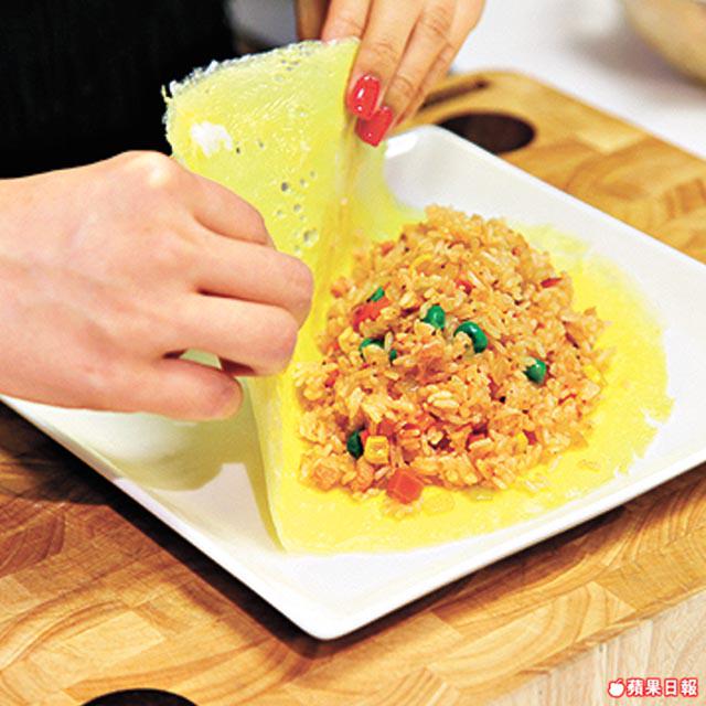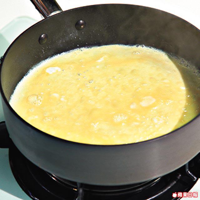 煎蛋皮時要留意,當蛋皮跟鑊邊分離才可以用鑊鏟翻動,否則蛋皮會很容易弄爛。