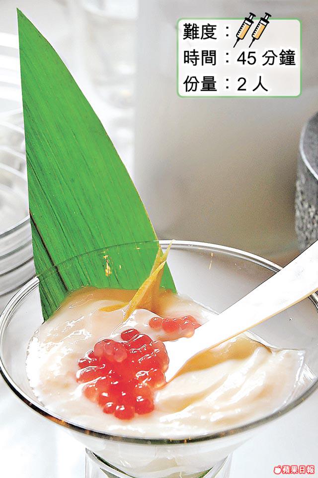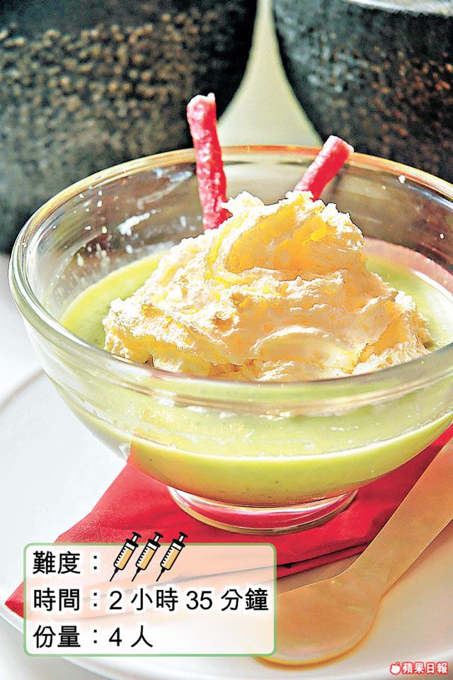 ④ 從雪櫃中取出氣壓奶油槍,將氮氣安裝好後搖勻,唧在青豆湯面便可。