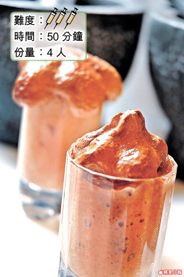 ① 隔水熱溶朱古力,待稍凉,跟忌廉、全脂奶、糖粉和蛋白拌勻。以小火稍為煮熱至完全混合,倒入氣壓奶油槍中,放入雪櫃冷凍30分鐘。