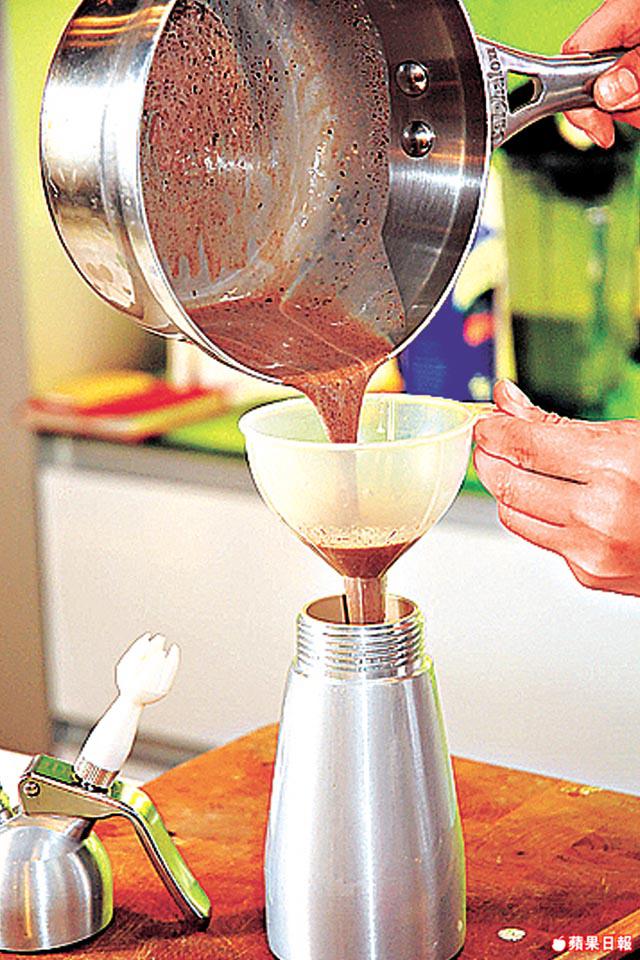 做慕絲時要打入大量空氣才能形成輕滑的口感,由於家中設備所限,口感往往有些差距,Charmine改用這氣壓槍做出朱古力泡泡,效果極佳。