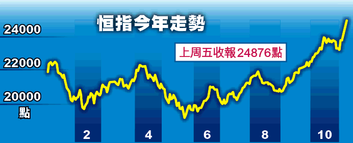 康宏證券及資產管理董事黃敏碩指出,大市上周一口氣逼近二萬五,周初料先行唞唞,但回落幅度不會太大。他預期即使指數回落,中價股份或追落後上升,可留意本地銀行股及半新股。本周G20召開領導人會議,雖然難有突破性發展,但要提防美元借勢反彈,衝擊股市及商品市場。