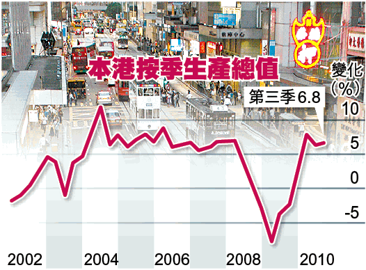 【本報訊】港府公佈第3季經濟增長持續,期內本地生產總值(GDP)增6.8%,按季升0.7%,是連續第6個季度擴張。政府經濟顧問陳李藹倫提醒,要注意資產市場泡沫,雖然目前按揭供款負擔比率為42%,與過去20年的53%平均數仍有距離,但強調按息若上升3厘,有關比率便會攀至相關水平。