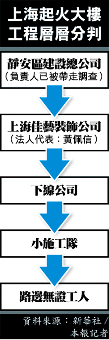 上海市靜安區發生的冲天大火災,國務院調查組查明是一宗涉及層層分包的違法違規責任事故,工程最少被外判三次,最終由路邊散工負責電焊,引發造成53死、36失蹤、70人傷的慘劇。有內地傳媒人追查發現,其中一名承包商不用投標便取得工程,而該承包商的法人代表與靜安區區長夫人關係密切,被指有官商勾結、涉貪腐之嫌。