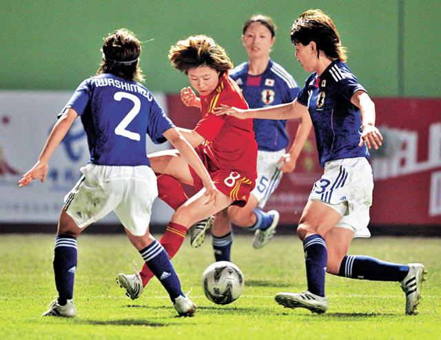 中國女足隊昨日在準決賽力戰至加時以0:1不敵日本,無緣入決賽。圖為徐媛(中)遭日本球員夾擊。美聯社