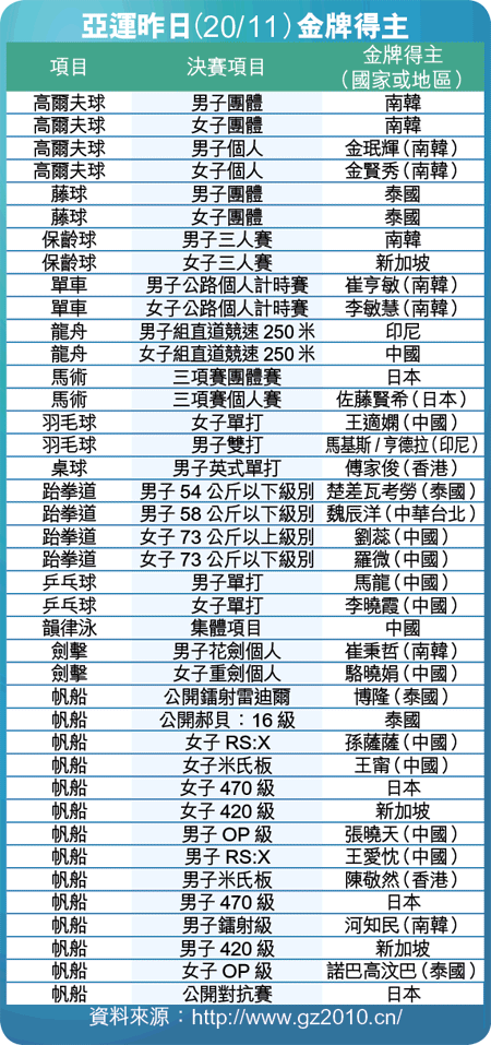 【綜合中國外電】中國上周六於乒乓球男、女單決賽摘金後,於今屆賽事贏取乒乓球項目全部金牌,並繼1978年曼谷亞運後再次創造出包攬7金的壯舉。