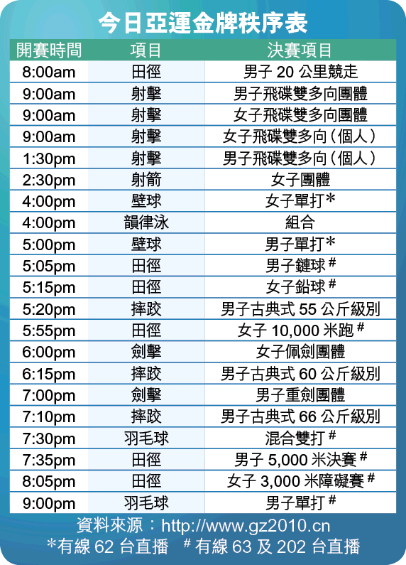 衞冕男單的王皓及隊友馬龍,上周六於4強分別打敗日本名將水谷隼及南韓球手朱世赫而晉身決賽,隨後馬龍以9:11、11:8、11:7、11:3、4:11及12:10打敗王皓;加上郭躍和李曉霞分別擊敗日本的福原愛及南韓的金景娥而合演女單決賽,並由李曉霞以局數4:3勝出;連同之前於男、女團、混雙及男女雙取得的5金,中國終一償心願,相隔32年後再於亞運包攬7金。