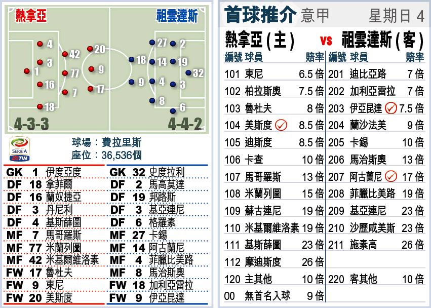 熱拿亞與周日來訪的祖雲達斯最近似之處,莫過於同樣擁有國內當時得令的守將壓陣,加上一隊鋒力欠銳,一隊缺射手,此戰勝負難料,「細」卻不乏捧場價值。(球賽編號:星期日4;now633及660台今日7:30pm直播)藍鑽石