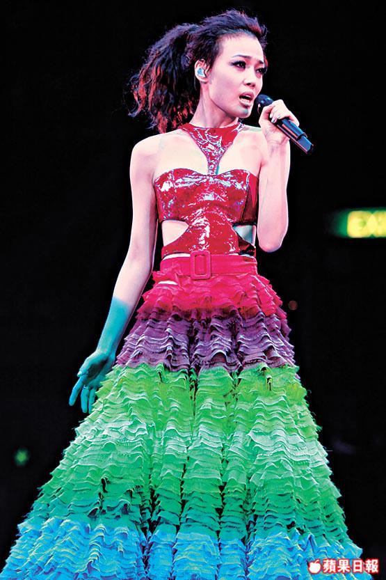 容祖兒前晚在紅館舉行「容祖兒Number6演唱會」,全晚以多個造型出現,踏入三字頭中女的祖兒,除了有七彩蝦條姐姐、旋轉木馬裙等可愛造型外,她更大騷性感,先後以黑色貼身低V裝、紅色中空長裙及喱士睡衣look示人,雖然減磅後的她只剩微波身材,但她仍不吝惜大騷本錢,實行挑戰同是平胸一族的鄭秀文(Sammi)。