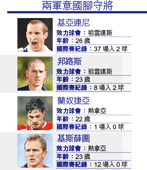 自簡拿華路及尼斯達等老將退出後,意國後防線亦開始年輕化,一班80後乘勢上位。剛在上周三上演的國際賽中,分別效力祖記及熱拿亞的邦路斯及蘭奴捷亞,就為意國扼守中路,效果不俗,相信兩名小將在國家隊的前途光明。