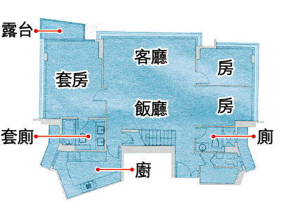 戶型屬大廳大房格局,沒有部份新盤為增加房間數目而犧牲睡房空間的失衡設計。不過,方正大廳夠闊不夠深,客飯廳分野欠清晰,亦限制了家具佈局。套房夠氣派,客房則長而不闊。