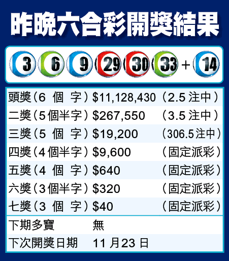 【本報訊】上期六合彩頭獎無人中,令到昨晚有多寶2,500萬元,巨額獎金最終全數送出,頭獎每10元一注派1,112萬元。