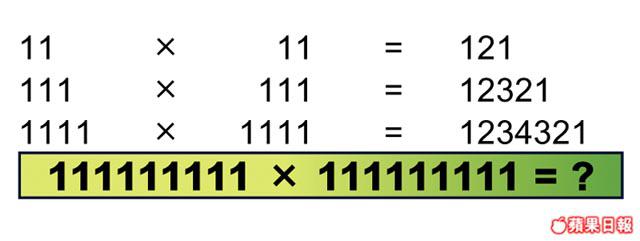 這些數的自乘是有規律的,如111這個三位數自乘,中間的數字就會是3,然後前及後剛好是順序倒數;1111這個四位數自乘,中間的數字就會是4,餘此類推。因此111111111這個九位數自乘,答案就是12345678987654321。