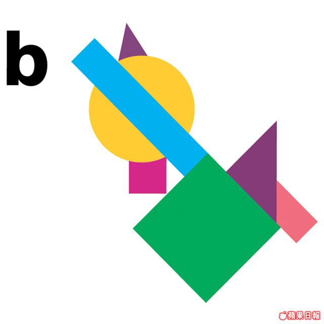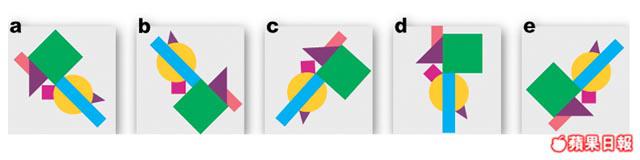 野野子用三角、圓形、方形等積木拼出以下的圖案組合,當中有一個是不同的,快找出來吧。