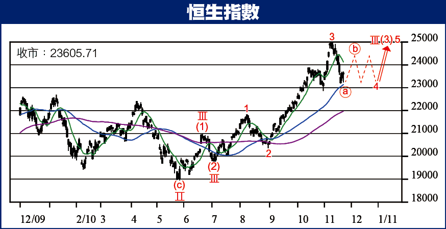 上周三(11月17日)恒指23192(H指12855)為中浪(3)小浪4細浪a調整低位,目前為中浪(3)小浪4細浪b反彈,目標區為23900/24300(H指13400/13700)。大浪III上升目標為2007年高位附近─恒指31000(H指20000)。大浪V破頂創新高。