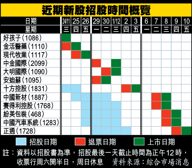 另外,消息指,周一截止認購的大明國際(1090)以2.1元定價,接近招股價範圍下限,12月1日掛牌。現代牧業(1117)亦以下限2.89元定價,本周五掛牌,人人有份。