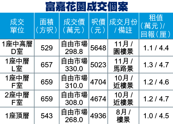 富嘉花園11月截至16日錄得2宗成交,10月全月亦只有2宗成交,平均呎價4689元。9月更沒有成交。