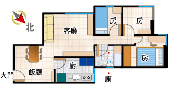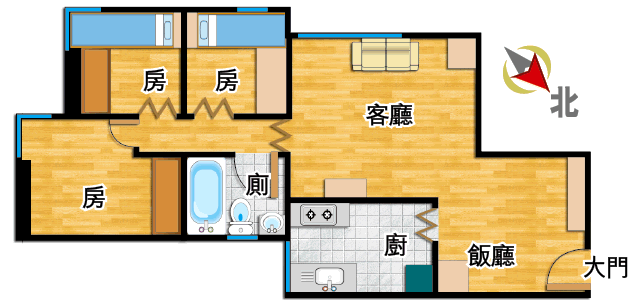 單位屬呂字廳間隔,無玄關位,地方見使,尤其客廳偌大,大房有衣櫃凹位,增加家具擺位的彈性。長形廚房通道亦闊落。但內櫳一般,部份天花線被拆掉,入牆家具陳舊,廚廁保養一般。買家需花一筆錢翻新及裝修。另廚房及兩間細房一律改用摺門,視乎買家喜好,或需更換。