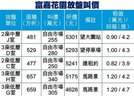 介紹的富嘉花園1座中低層G室,659方呎,屬最大面積三房單位,廳房向西南,有西斜情況,但坐擁單邊地利,遠樓景致開揚,但前臨馬路有車聲。單位叫價335萬元,呎價5083元,屬市價水平。