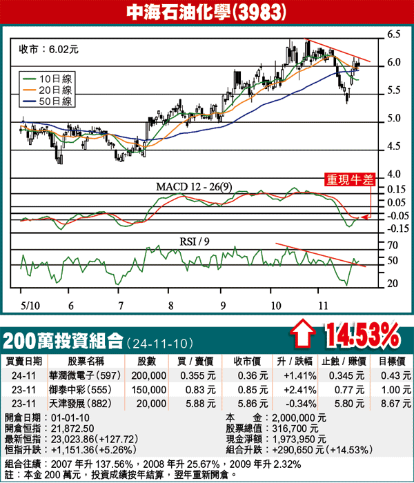 化肥股近日明顯跑贏大市,例如中海石油化學(3983),股價於本月初隨大市急跌,由6.34元跌至5.33元,但由上周三開始作V形回升,一度高見6.16元,收復大部份失地。