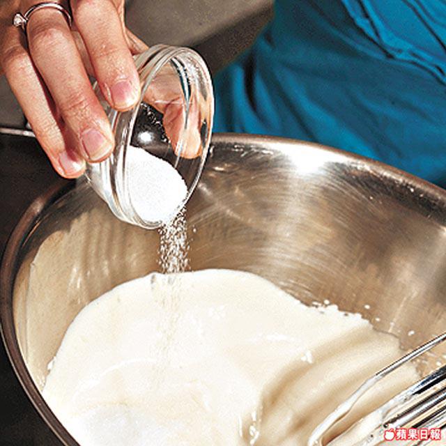 加點糖讓空氣拌入,有助忌廉打拂得更蓬鬆和更高。