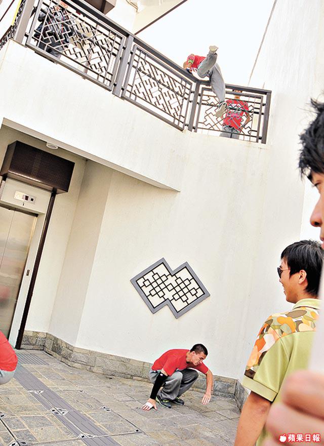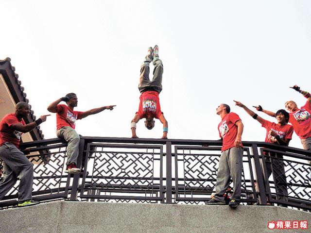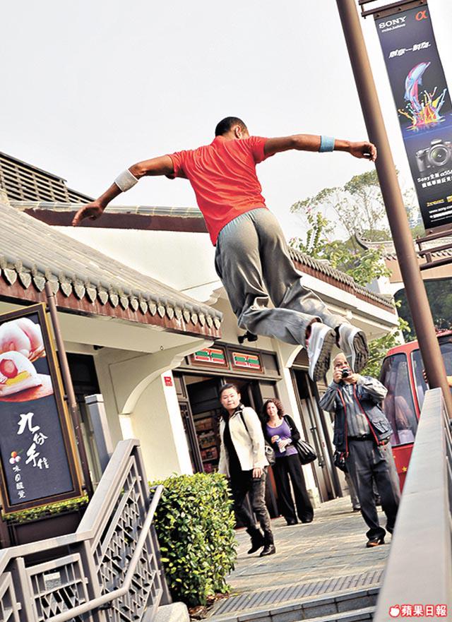 嘩,看着這一行七人飛簷走壁,原來世上真係有輕功。「我自小就好動,看到成龍電影手舞足蹈,不過人人都說輕功已失傳了,沒有想到真的有人懂。」香港的Parkour表演者阿泰說。曾指導過好些香港人的,是如今留在香港發展的法國人Yannick,問佢Parkour危唔危險,佢答:「它看來很危險,但其實我們一次也沒有受過傷!」