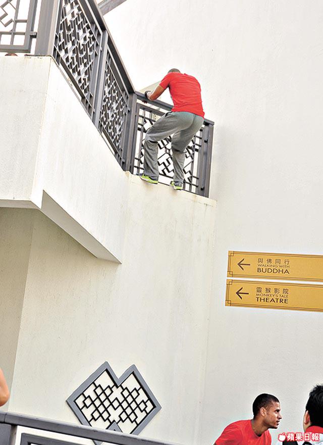 高台起碼十呎高,Matthias無有怕,在上面玩慢板倒立。
