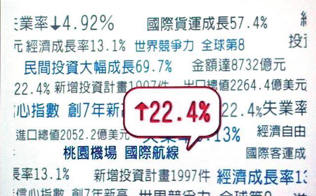國民黨文傳會主委蘇俊賓昨向媒體介紹兩齣新廣告時,不無得意稱,國民黨要訴求經濟繁榮;強調這兩年國民黨執政,台灣表現「真的不錯」,這些數字,民進黨是無法否定的,「可以放進廣告的數字太多了!」蘇說:「很多數據沒放進來。也許我們有點貪心,但是這是台灣人民共同打拼的成果,民進黨不能為了選舉,就否定這些成果!」