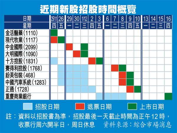 正在招股的十方控股(1831)銷情也不理想,統計本地8間證券行,孖展借貸乏人問津,只得100萬元,十方今截止認購。另外,兩隻風電相關股份——大唐新能源與華能新能源各集資超過78億元,消息透露,大唐決定延期上市,希望等到投資氣氛好轉,以較高招股價招股。華能暫定下周一進行投資者推介,但仍在觀察市況,上市時間表有機會變動。