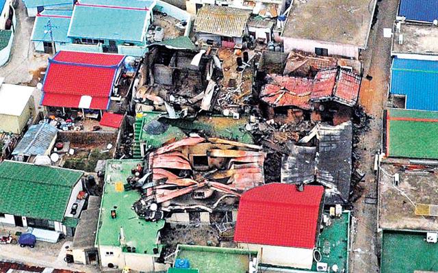 被炮轟的延坪島上,一片頹垣敗瓦,由YTN電視台播出的影像可見,一列一列的房子,牆壁都被炸塌,玻璃窗碎裂,甚至整棟燒毀或夷為平地;居民擠在防空洞內,被嚇壞的小朋友裹着毛氈發呆;有男人拿着鏟子走在廢墟間清理。