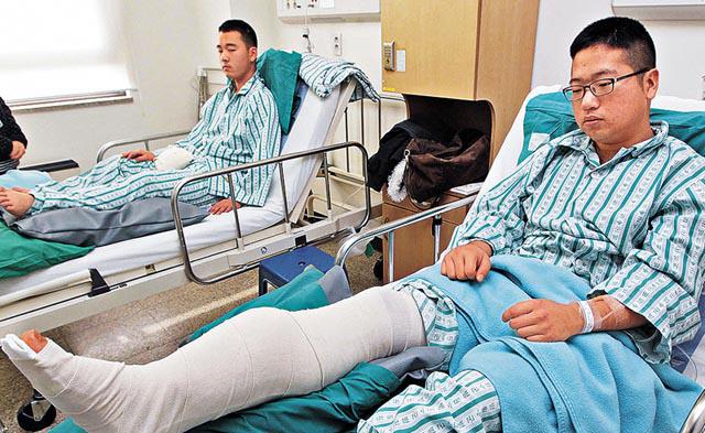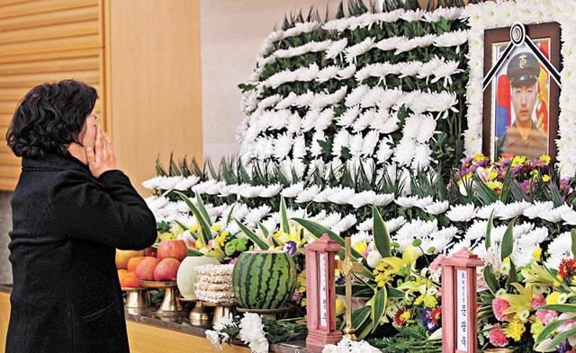 在首爾市郊一間軍方醫院,昨天愁雲慘霧,兩名喪生軍人的親友在追思會上痛哭,其中一名母親為失去22歲兒子悲慟不已,嚎叫「讓他回來呀」,心力交瘁下更雙腿發軟仆前,親友急忙扶着她。