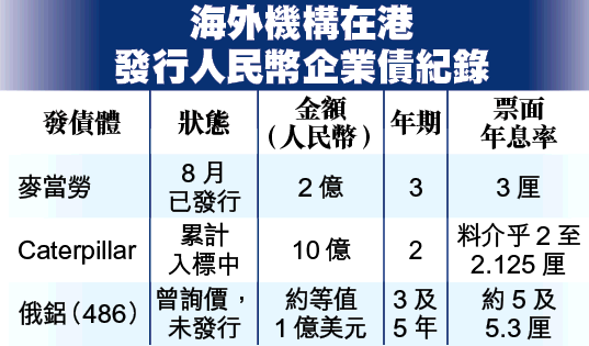 全球最大推土機及挖掘機械工程製造商Caterpillar,是次發行的人債,乃繼連鎖集團麥當勞後,第二間在港發人債的跨國非金融機構。麥當勞今年8月在港發行3年期共2億元企業人債,票面年息率為3厘。
